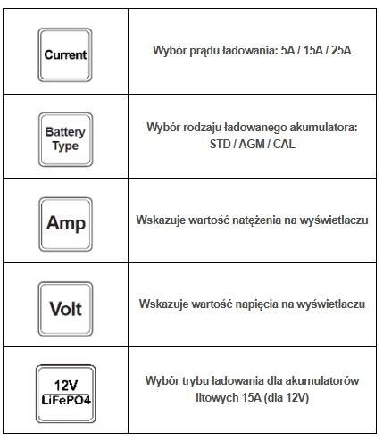W zależności od wyboru funkcji wyświetlacz LCD wskazuje stan pracy prostownika: