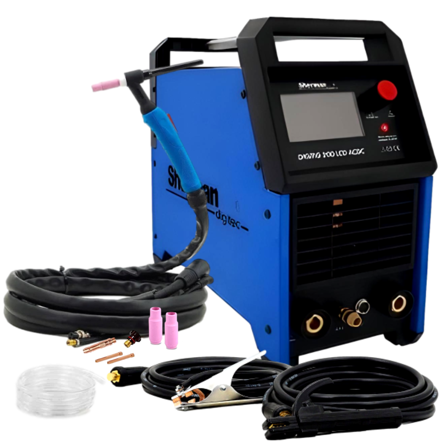 - W komplecie znajduje się uchwyt spawalniczy TIG, przewód elektrodowy i przewód masowy.